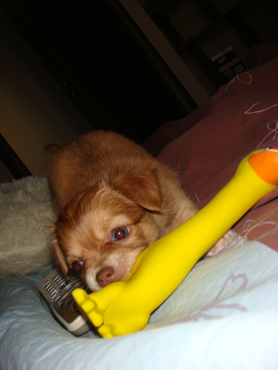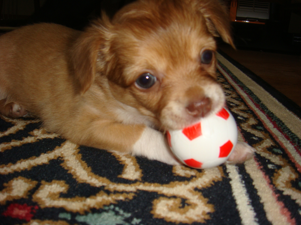 Нам сейчас 7 недель, очень любим грызть папины и мамины пальцы, кусать за нос и плюшевые тапки=)))