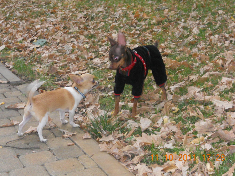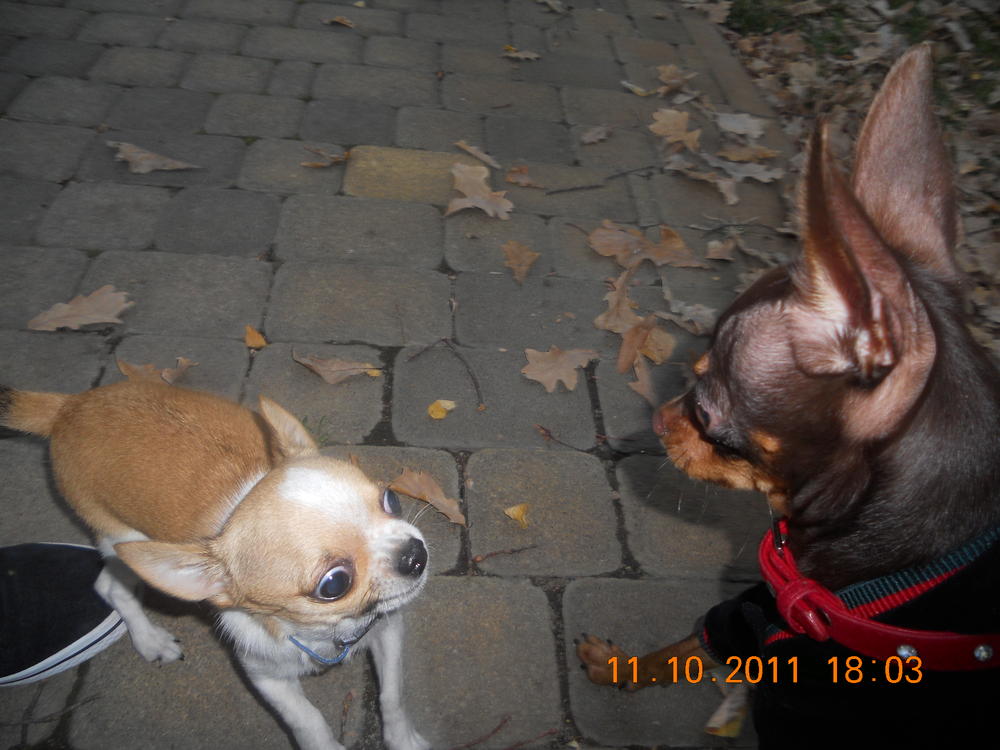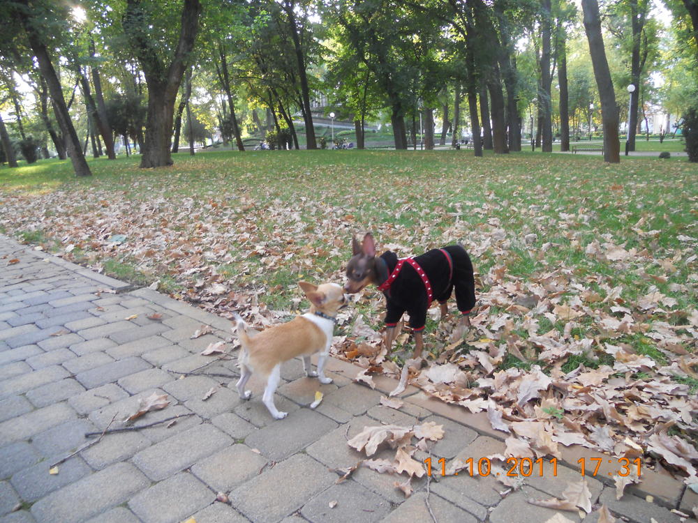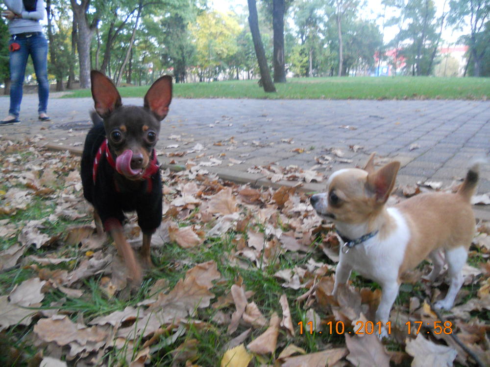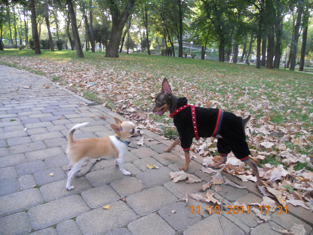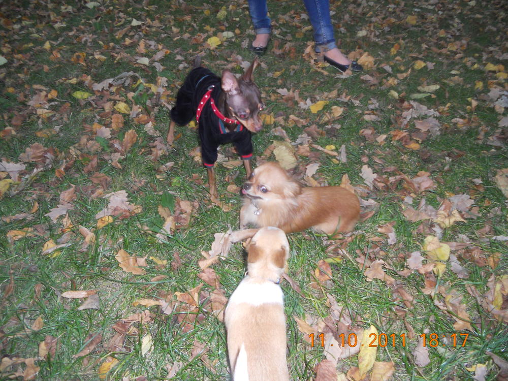 Ну нагулялись мы сегодня опять до отвала) познакомились сегодня с двумя тоями и одной девЧИШЕЧКОЙ, тоже миничкой) носились как угорелые, почти не получилось поймать хорошие кадры. Сегодня,кстати, он впервые уже у нас игрался с другой собакой, правда игранием это сложно было по-началу назвать. В общем первые минут 15 Лакки пытался укусить тоя за шоколадный нос, ну а потом уже начались бесилки)) А потом к нам присоединилась девЧишка) Лакки как подменили, прямо такой джентльмен стал-на нее он уже не гавкал и не пытался укусить, а нюхал ей мордочку и был ооочень аккуратным с ней. Так наблюдать за ним интересно)