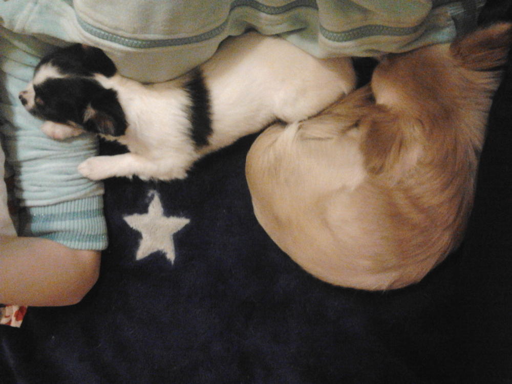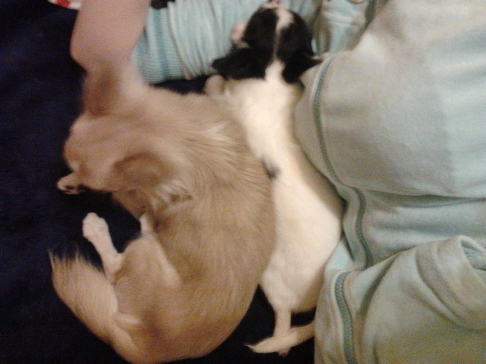 На удивление мальчики мои быстро подружились!сначала конечно старший погонял мелкого,но потом после моих нравоучений,они подружились...мелкий(Босс) тоже "не пальцем деланный",прет как танк на Гуччика...забирает в наглую у него игрушки,кости..старший хотел его наверно порвать на мелкие кусочки,но увидев мое выражение лица-смерился....под конец вечера малышня даже игралась..потом Босс стал насиловать(доминировать) моего старшего..я была в шоке..никогда не видела чтобы щенок,которому и 3-х месяцев нет,пытался делать такие движения-прям все по взрослому...но он малыш умненький и очень смелый,так что я особо и не удивлясь:laughing: