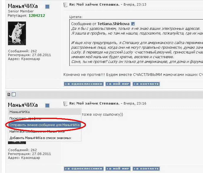 Можно отправить личное сообщение. Нажать на синий квадратик рядом с ником и выбрать -отправить личное сообщение
