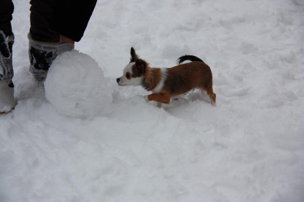 Знакомство с улицей было на удивление не страшное, уж очень нам понравился снег, прыгала как кролик=)))и всё было так интересно, с жадностью ела снег.Сначала вышли в кофте,но это нам быстро надоело
