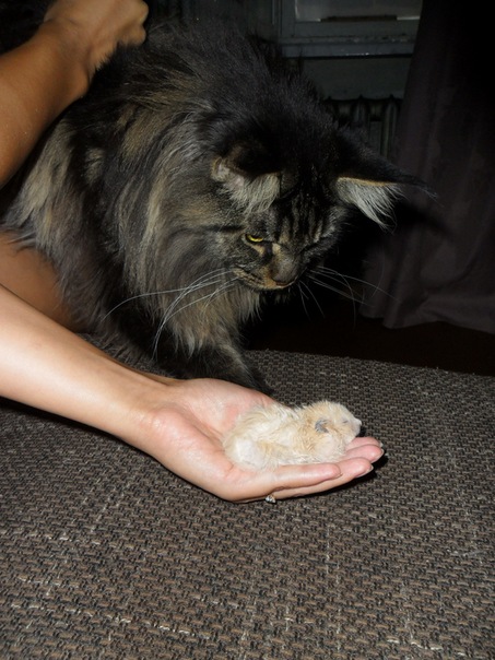 Выложу еще фото нашего кота породы мейн-кун Тишки, которому Перчик любит вылизывать ушы, и хомочки Бусинки(только вот на нее Перец пытается охотится)