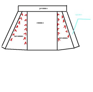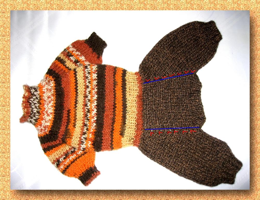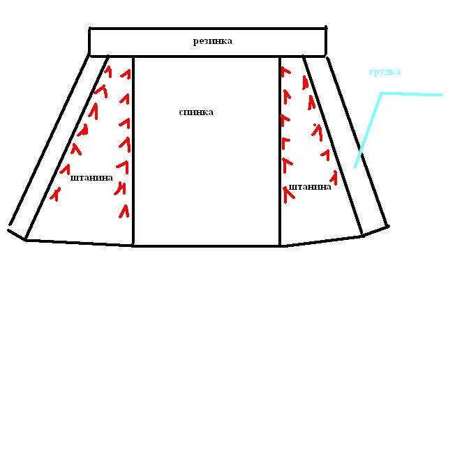 Как же это не реглан. Те же самые прибавки по четырем регланным линиям , только ты в верхей части комбинезона прибавки делаешь с двух сторон регланной линии и расширение идет и на рукав и на спинку и на животик если надо. А здесь ты расширяешь только штанинки, то есть с одной стороны линии, а с другой прибавки не делаешь. Регланную линию также вяжешь изнаночной петлей. Синяя линия и есть та изнаночная петля от которой идут прибавки.