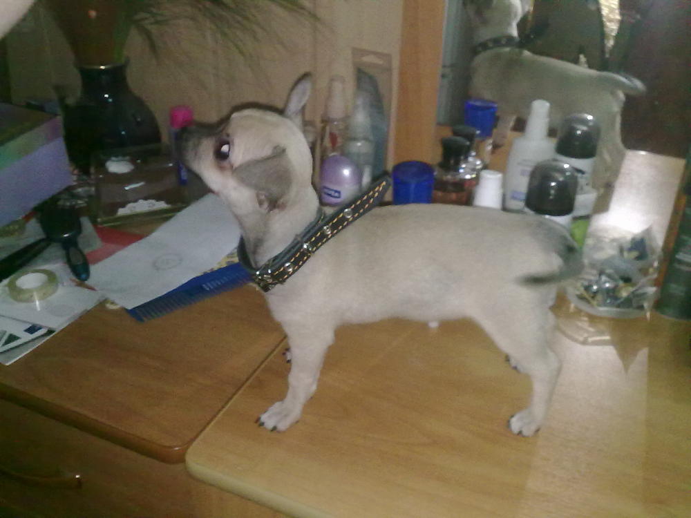 Спасибо девочки за поздравление!Мы сегодня сделали прививку,и одели первый раз ошейник!Сначало он нам не понравился и мы крутили головой,катались по кровати,старались снять,но сейчас уже успокоились.Стараемся делать стойку,но как то не очень получается,постоянно вертит головой по сторонам..((Показываем то что получилось,не судите строго..