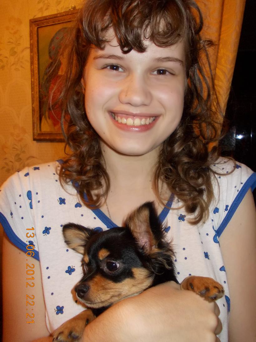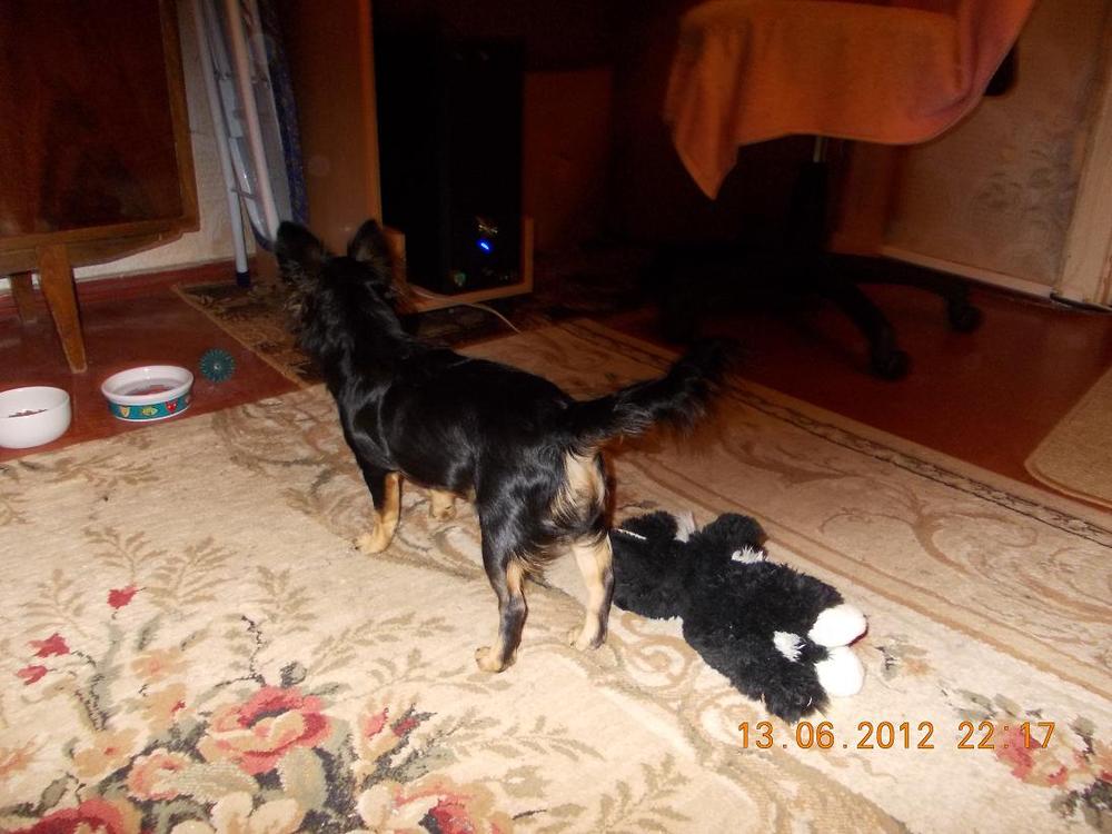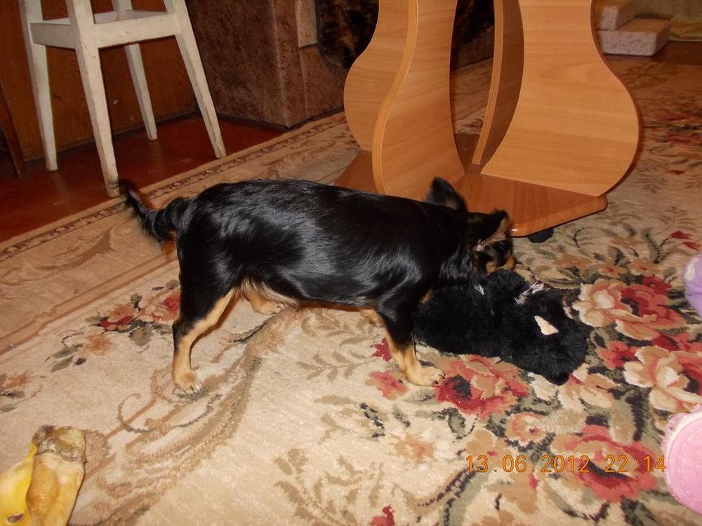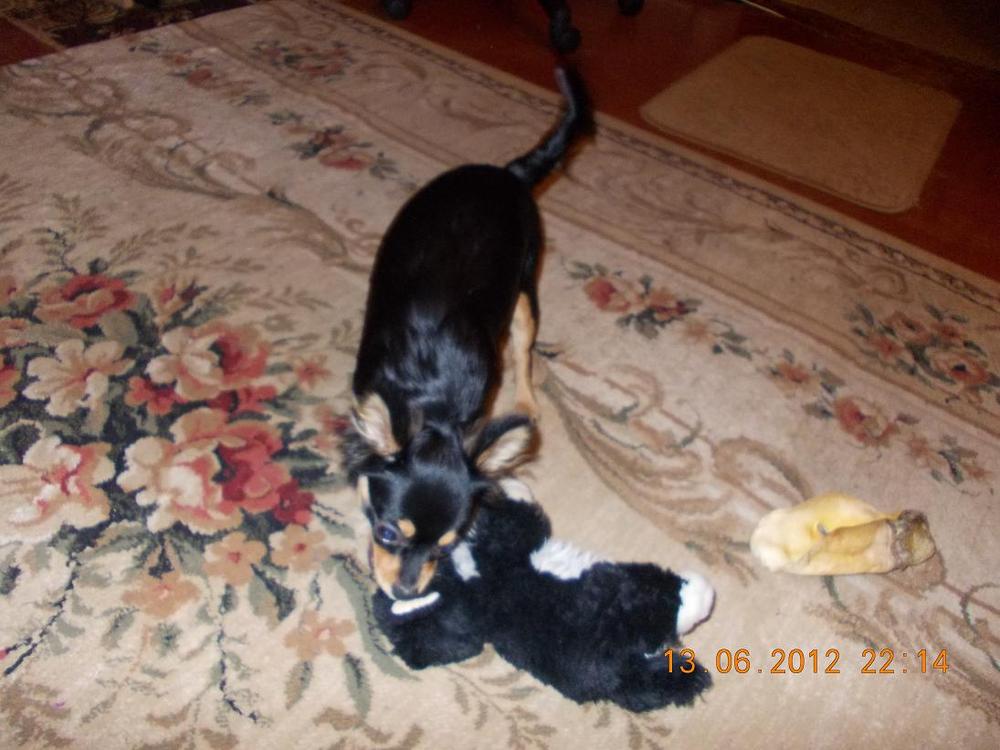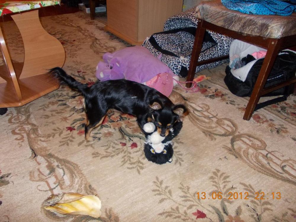 Всем добрый вечер. Читать темы у меня тихонько на работе еще получалось, а писать никак. Наконец-то появилось немного свободного времени. И я могу немного рассказать о нашей любимочке. 10 числа ей исполнилось 6 месяцев. Выросла она у нас крупненькая. Длина по спинке 23-24 см., высота в холке 22-23 см., окружность груди 34 см., вес 3 кг. Так что стандарт она наверняка перескочит. Ну и ладно, зато она у нас самая самая любимая. Вот так она играет с игрушкой.