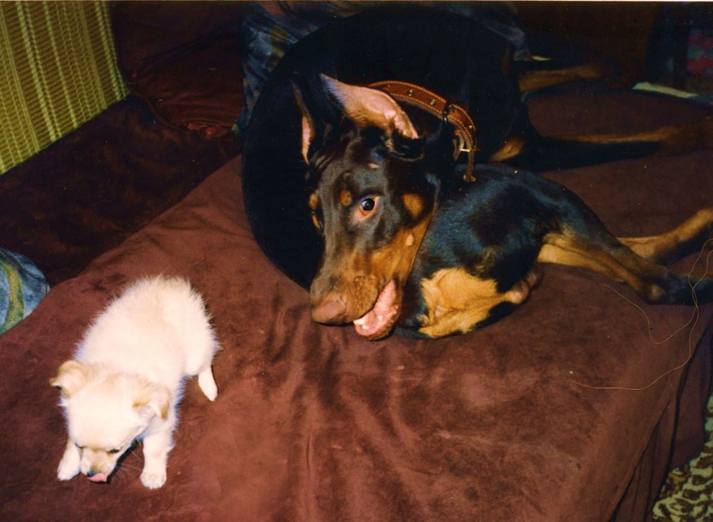 А история, которую я начала рассказывать закончилась благополучно. Домашние были очарованы щенком, он получил кличку Мэйсон или просто Манюся. Наш доберман Ташик занялся его воспитанием, он был на удивление терпелив, когда однажды я увидела такую картину - Ташик лежит на полу, разинув пасть как крокодил, а из пасти торчит манюсин хвостик, я чуть не грохнулась в обморок. Но наш добик держал пасть разинутой до тех пор, пока Манюся видимо не пересчитал все зубы всоего наставника.