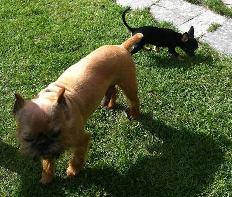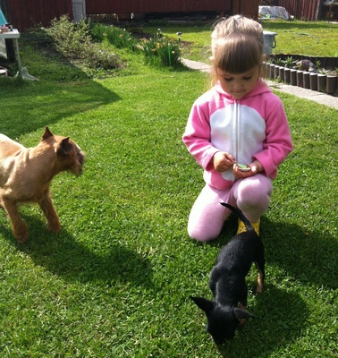 Дома он сразу всех очаровал, особенно дочек, у них любовь взаимная. А вот наш гриффон сначала был не в восторге, но держал нейтралитет, не обижал. Сейчас привыкли друг к другу. Друг у друга корм воруют, дак я им корм местами поменяла - каждый ест свой корм и при этом в полной уверенности что ворует:smile:)