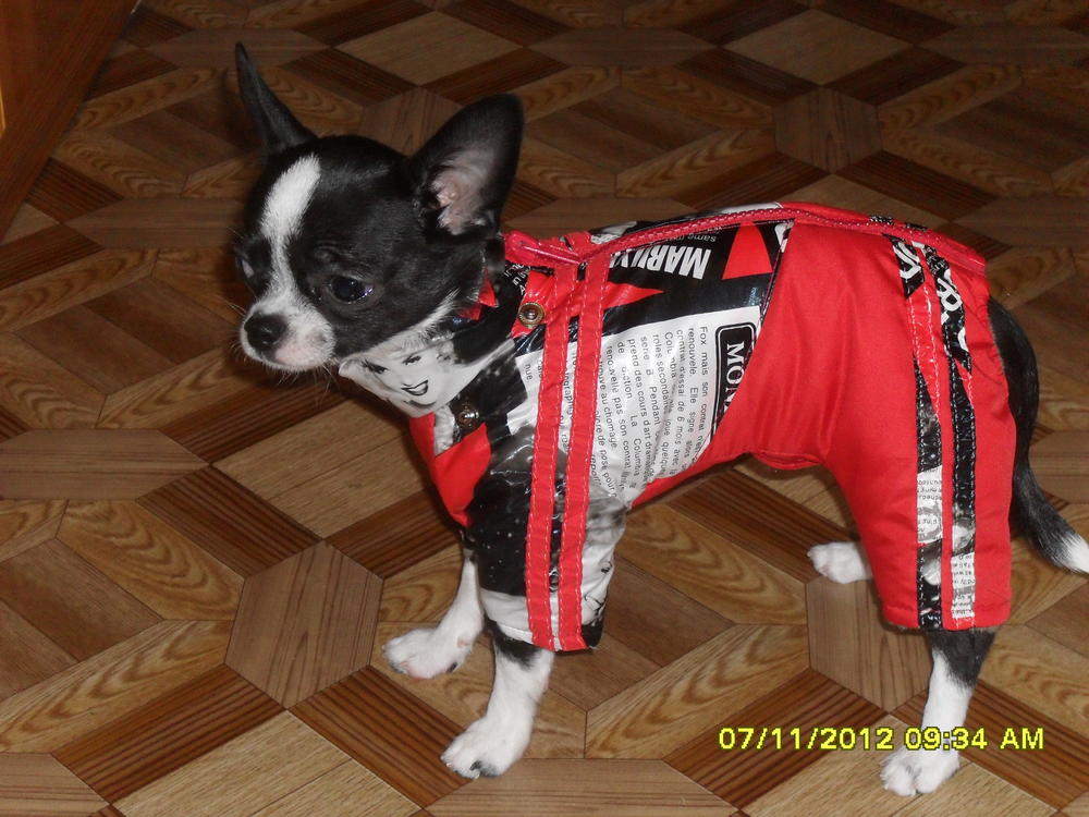 Не расстраивайтесь =) По началу почти все они не понимают, зачем эти тряпочки-обвесы нужны =))). Вот начнутся холода - вы его сначала без комбеза выведите, он конечно замерзнет, а второй раз в комбезе, обычно этого хватает, что бы собака оценила разницу и примирилась с необходимостью ношения одежды =).