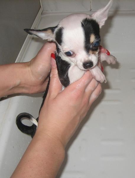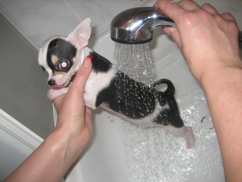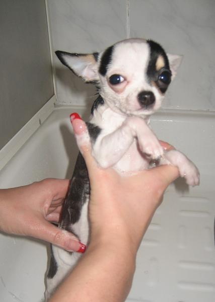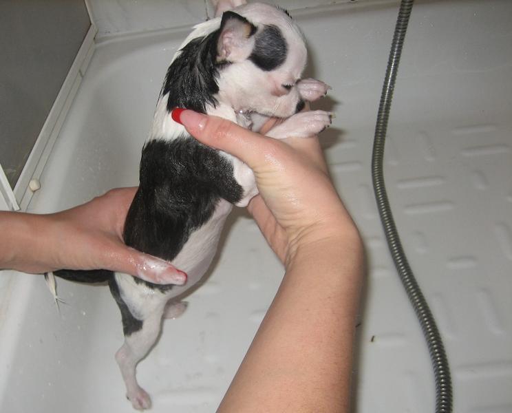 Боня мылась первый раз - и надо сказать ей это не особо понравилось! Но стояла она смирно, иногда пыталась вылезти из душевой кабины - у нее глаза такие несчастные были! И она посто не понимала, что это с ней такое делают! Ну а Джесс как вседа мужественно терпела и стояла смирно!