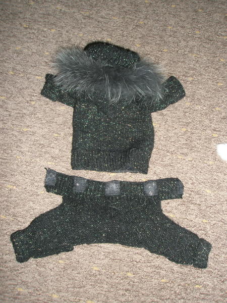 Первый мой опыт по пошиву комбеза. Взяла польтовую ткань, по пяссу, лапам и капюшону пришила искуственный мех. Прикольно получилось, но он уже чуть маловат.