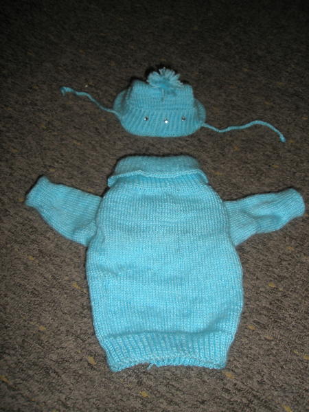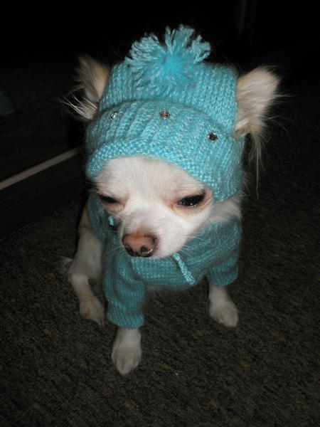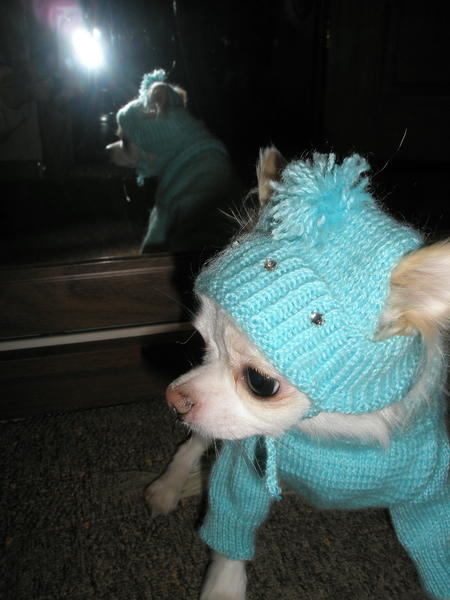 Уже устал позировать. Предпоследняя вязаная модель. Голубая кофта и шапочка со стразами.