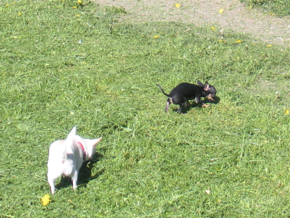 А сегодня, например, познакомились с двумя красивейшими таксами! Они сначала не подходили, смотрели как завороженные на то, как Шиши огалделая носится кругами по одной и той же траектории вокруг Бибу, пока у мелкой головешка не закружилась