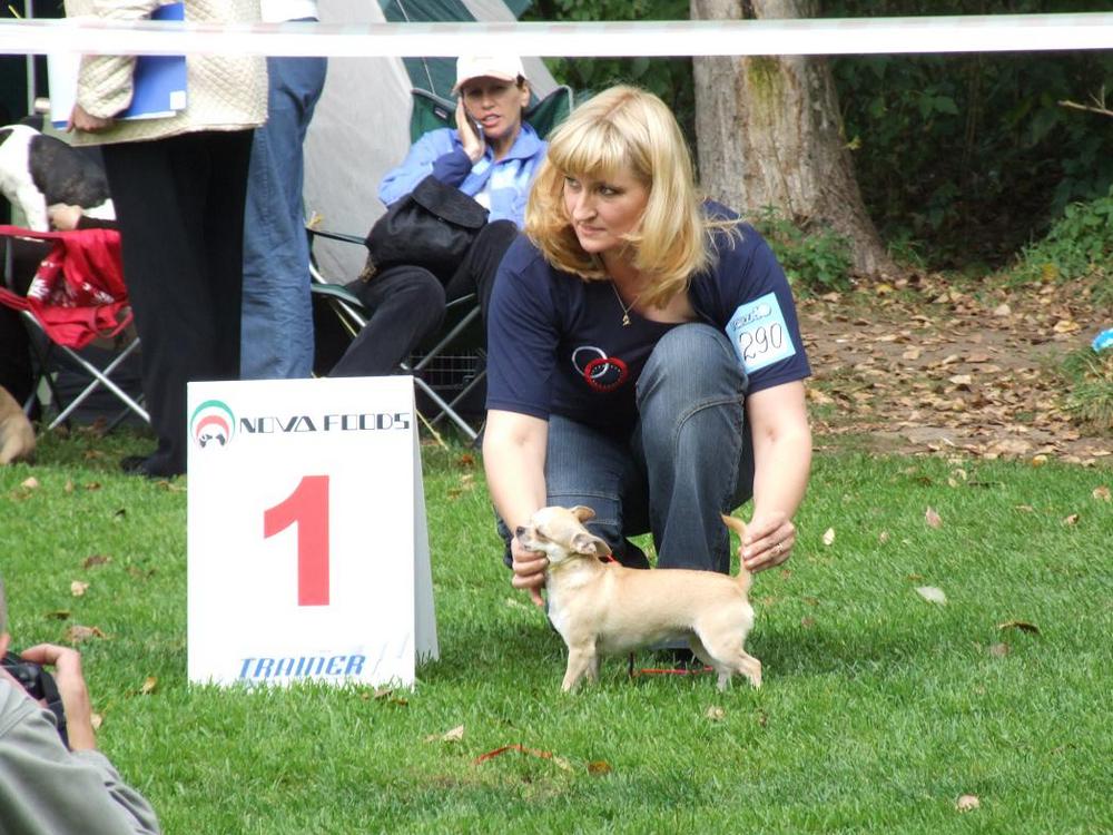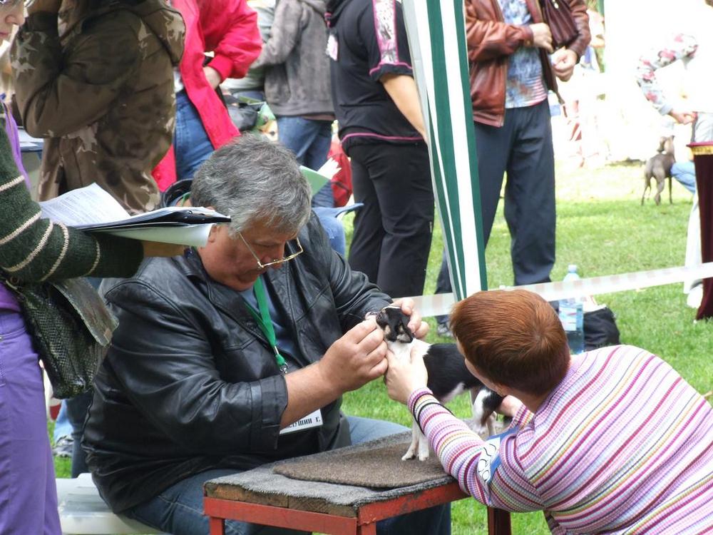 Девчонки!!! Вчера первый раз выставлялись с Сантой! :clapping: в Красноярске "Звездное шоу Красного Яра" Судья Поливанов М.А. Она в бебиках была, так бедняжка боялась, дрожала вся, хвост поджимала, кое-как её распрямила. Итог - ЛБ, 1 оч. перспективная, всё замечательно, только корпус сказали чуть удлинен, но это не страшно, вырастем, всё на место встанет. :wink: Всё норально, куча впечатлений, первая выставка....:smile: в бэсте участвовали, вроде так это называется, там лучших бебиков всех пород сравнивали, вообще нас обидели, ребенок мой старался, десять минут в стойке стояла :confused: аж ножки затряслись, некоторых сразу отправили, остальным три места призовых дали, а мы как придурки стояли, как будто нас нет, пока заводчица наша не показала, что уходить мне надо. Ужасно некрасиво! И обидно... Но Аня сказала это прекрасная тренировка для нас была.