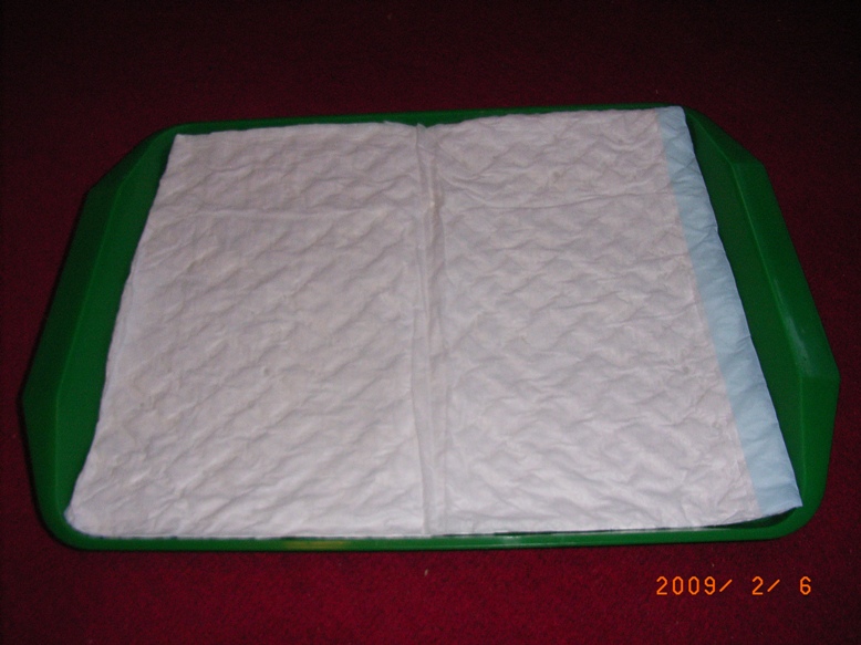 мы покупаем пеленки TENA 90*60, режем их, получается 4,5 пеленки размером 35*30 см, кладем их в поднос (чтоб если писает на край не стекало на пол) и туалет готов!!!))) :tonguewink: