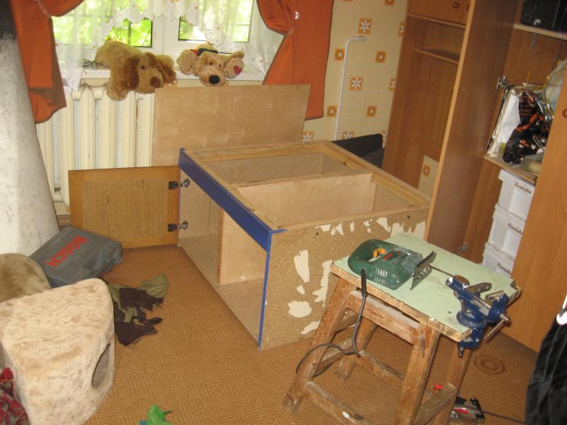 Сама от себя не ожидала, на что я способна! И электролобзиком пришлось поработать (выпиливала спинку для диванчика). И перетягивать ткань, и даже вспомнила навыки декупажа (применила внутри чемонада для игрушек).