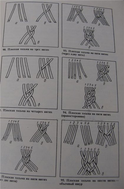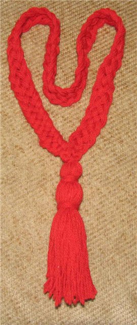 Вначале взяла пять ниточек по 60 см каждая, завязала в узелок ,оставив кисточку сверху , потом положила эту конструкцию на подушку маленькую, закрепила булавками сверху ниточки, чтобы они ровно ,по порядку лежали ,как на схеме и начала плести, не сильно затягивая . А когда веревочка уже длинная получится, вы сможете померить на песку, чтобы не туго через голову надевалась ,и закончить уже по своему выбору..либо просто завязать или сшить кончики или кисточку оставить или помпончик навязать.