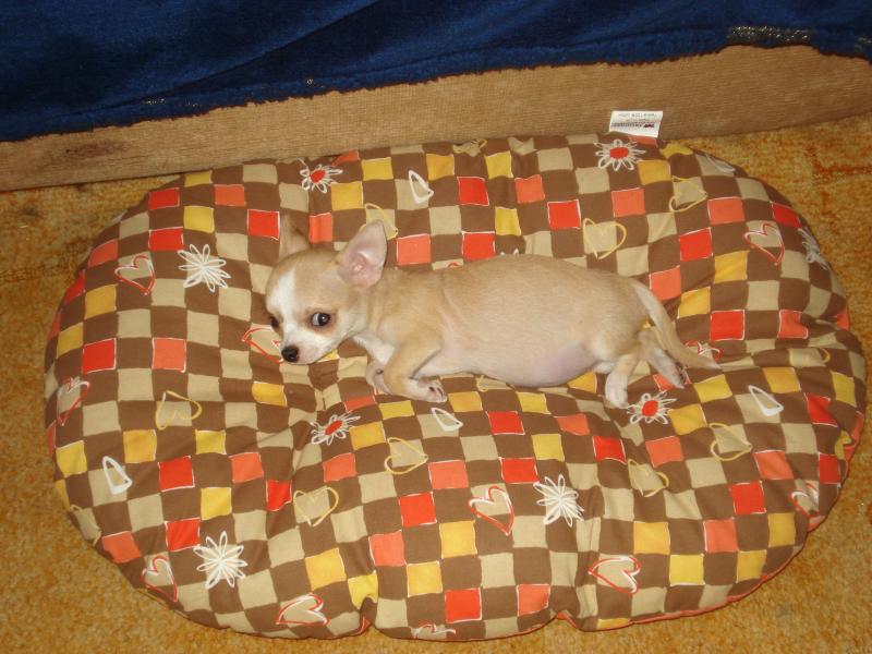 В общем, увидела я Кнопку на сайте питомника, когда щенки еще совсем маленькие были, там было фото помета общим планом, я еще подумала: О, какой щенок красивый! Но наверное, к моменту продажи его я уже найду своего щенка...(я ж мальчика-триколора все безуспешно искала). Но время шло, а мой щен так и не находился. Захожу я потом как-то на наш форум и смотрю детки в продаже. Щенок оказался девочкой, это меня немного расстроило, тк девочку я бы не потянула в плане стоимости. Вообще собу мне МЧ покупал, а у меня денег было прямо скажем немного, тк до сих пор расплачиваюсь за машину(. Еще мне очень понравился братик девочки и щенок у другой заводчицы тоже нашего форума. Я сразу же написала Марии в личку, стоимость обоих щенков меня приятно удивила, и до питомника ехать от моего дома 15 минут. Мы с МЧ решили съездить посмотреть, а на след день - в другой питомник, а потом уже выбирать. Приехали, дверь открыла очень приятная женщина, щеночков,которыми я интересовалась, она нам вынесла на кухню, мы стали с ними играть. К тому, что они окажутся ТАКИМИ маленькими, я была совершенно не готова, поэтому вид у меня был совершенно растерянный. К тому же все щенки( а нам еще и длинношерстного братика вынесли) были совершенно очаровательными. Мы долго играли с ними, заводчица отвечала на мои расспросы, потом вынесла нам их папу, очень красивого чи, который радостно похрюкивал, когда я чесала ему пузико. Но время шло, и пора было делать выбор. Кнопка уснула в лежачке, братики на нее наступали, и во сне,когда я ее позвала, она вильнула своим крошечным хвостиком. Это было так трогательно, что я чуть не заплакала(хотя я совсем не сентиментальная)) И тут я поняла, это моя собака,и мне никто не нужен, и я никуда уже не поеду, и не буду никого смотреть.