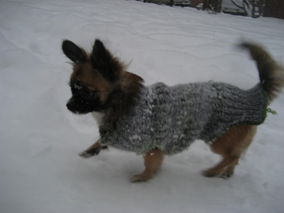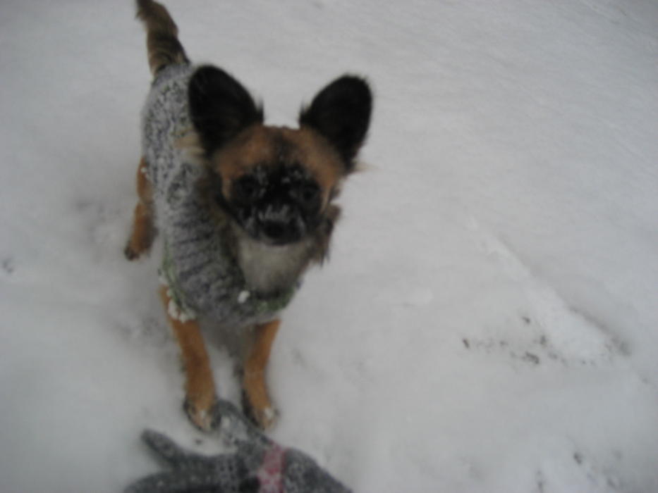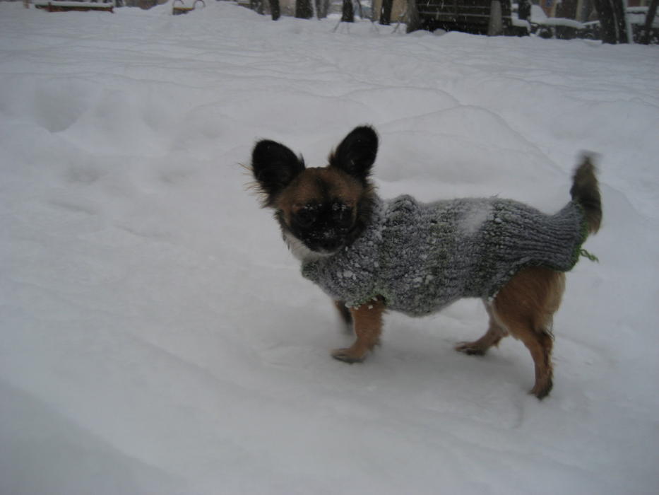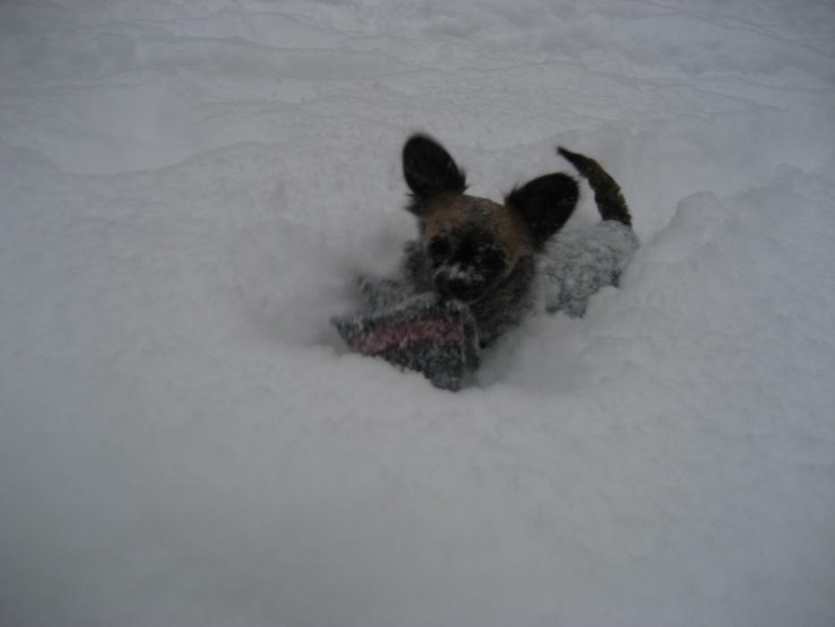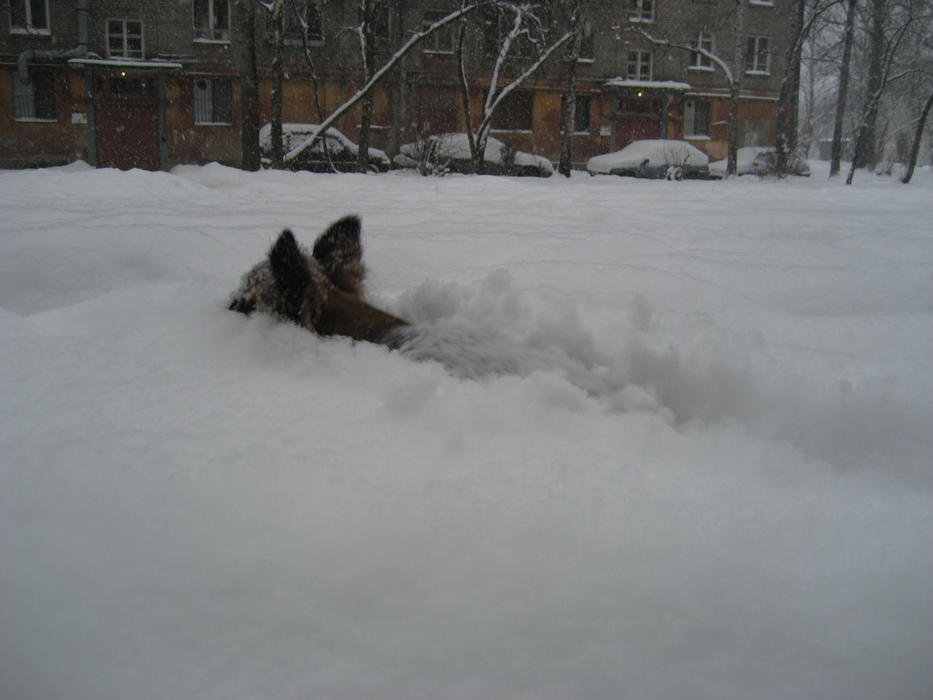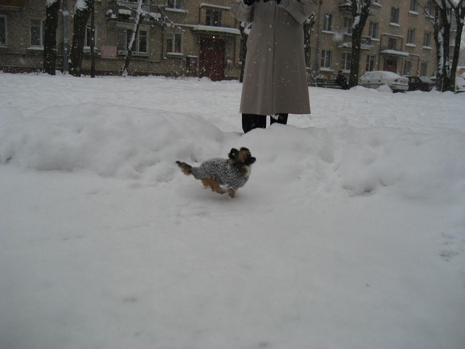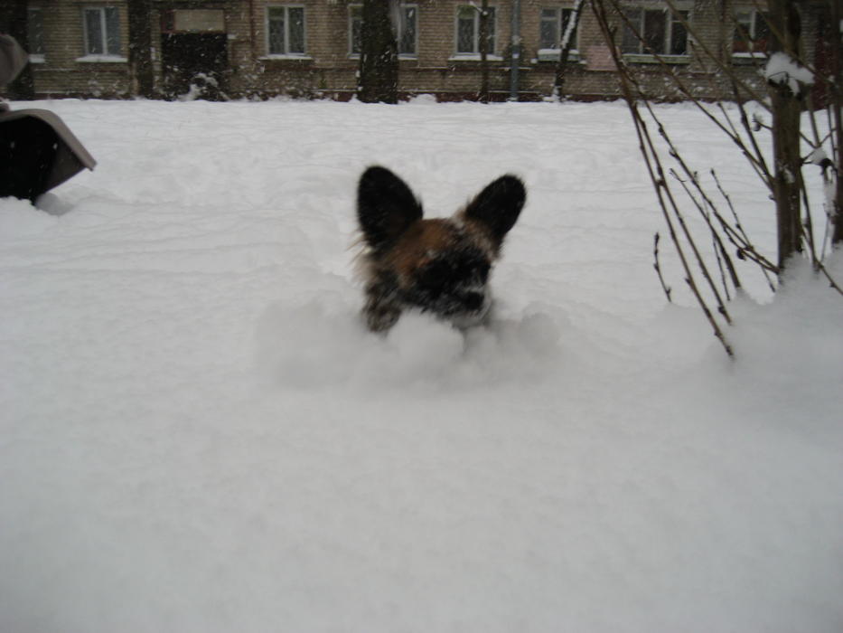 Бонька на прогулке дрейфует по уши в снегу. А вот мы гордые тащимся с добычей (роль добычи играла моя перчатка). А на последней фоточке Бонька выбралась на расчищенный от снега участок и начала нарезать круги с веселым лаем!