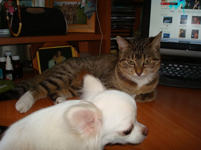 КОТ К НЕЙ ОТНОСИТСЯ ОЧЕНЬ НЕЙТРАЛЬНО, А ВОТ БОНЬКА ЕГО ДОСТАЕТ:smile: ГОНЯЕТСЯ ЗА НИМ ПОСТОЯННО И ХВАТАЕТ ЗА ХВОСТ, А ТОТ В ОТВЕТ ФЫРКАЕТ И БЬЕТ ЕЕ ЛАПКОЙ:tearsofjoy:
