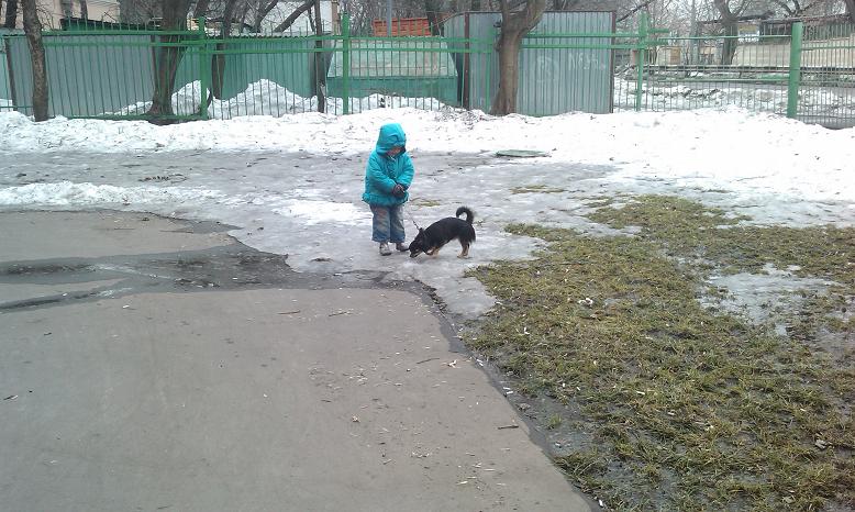 Гуляем во дворе. Сейчас во время нашего гулянья там аншлаг. Зимой не было никого, а теперь столько мам с маленькими детками!