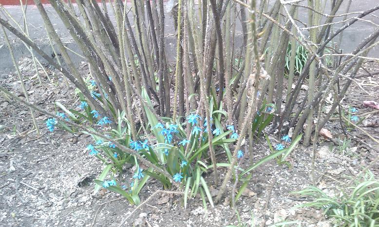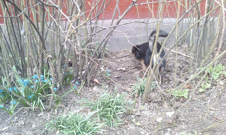 У нас во дворе в кустах расцвели подснежники. Карлос обожает лазить по этим кустам. Я очень хотела сфотографировать его в подснежниках, но он так не любит позировать.