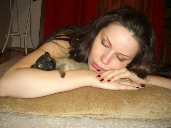 А это Белка с мамой спит( со мной). Любит лежать на руке или шее, когда спим.:wink: