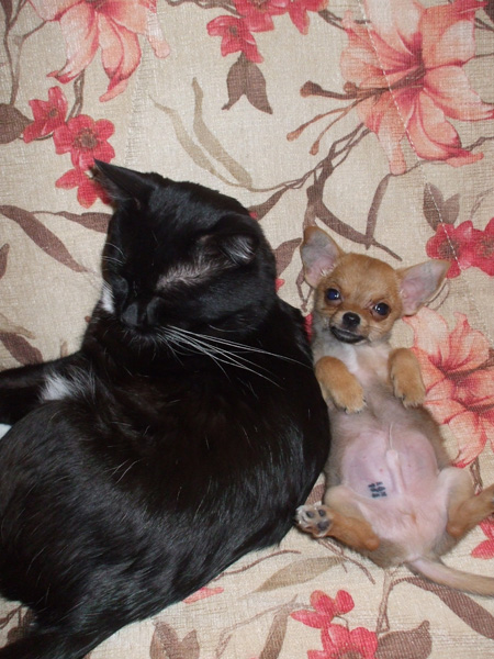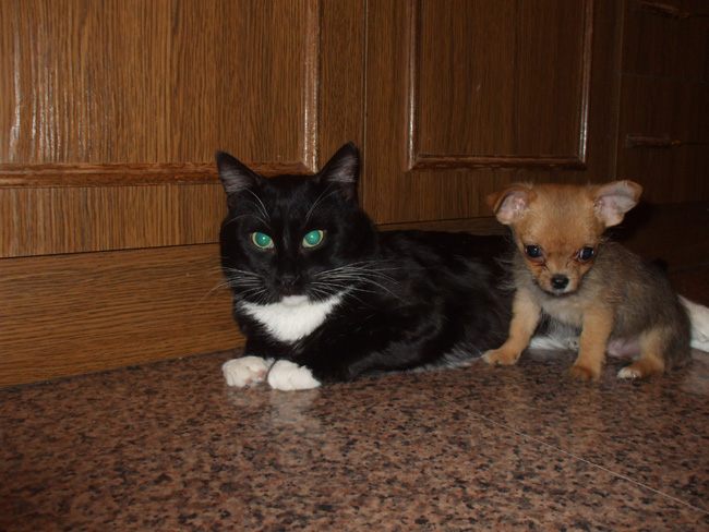 Изюмчик с удовольствием будет дружить, но кот....хм, если Маврик не в настроении лучше держать собу на руках, а иногда кот позволяет ему хвост грызть) Попробуй пойми этих кошачьих..)