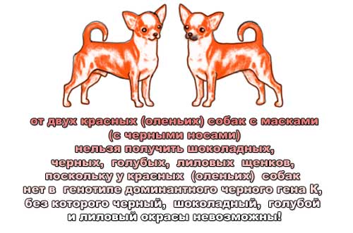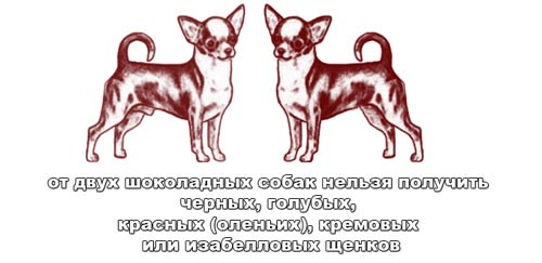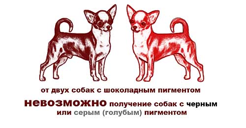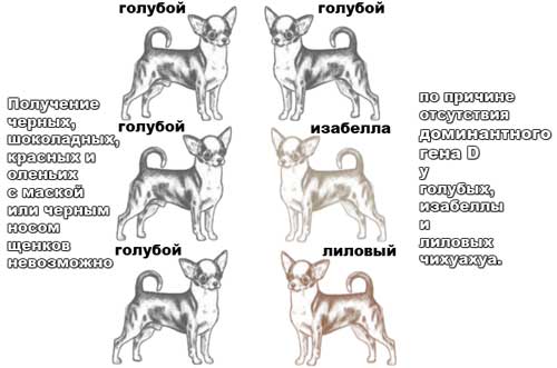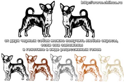 Для этих изящных маленьких собачек характерен широкий спектр окрасов: черный, черно-подпалый, соболиный, коричневый, коричнево-подпалый и коричнево-соболиный. Литтл (1957) отметил, что черные щенки могут быть получены от двух рыжих собак. Следовательно, у чихуахуа, наряду с геном Ay, рыжие окрасы могут быть образованы в результате экспрессии гена e. Однако, неизвестно, насколько этот ген распространен в природе. Рыжие окрасы настолько сильно варьируют по интенсивности, что можно предположить наличие в генофонде породы гена cch- или/и многочисленных ослабляющих руфус-полигенов, которые так уменьшают количество желтого пигмента, Что собаки становится почти белой. Голубые особи известны, но очень редки. Распространена ирландская пятнистость и пегость. Литтл отмечал, что могут встречаться и крайние степени пятнистости, вплоть до полностью белых собак. Все перечисленные окрасы встречаются как среди короткошерстных, так и среди длинношерстных вариаций.