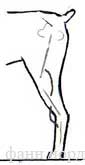 Угол между костями бедра и голени снаружи образует колено, а угол между голенью и плюсной образует скакательный сустав. Чем лучше выражено колено и скакательный сустав, тем лучше, потому что у такой собаки будет длинный шаг, хорошая амплитуда движения и, следовательно, хорошее продвижение вперед. Такая собака будет неутомимо сопровождать вас на прогулке, меньше устает, так как природа наградила ее прекрасными рычагами.