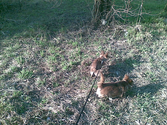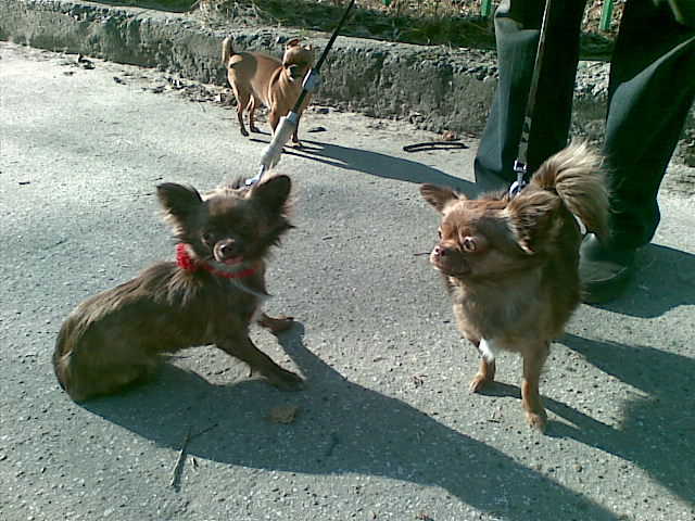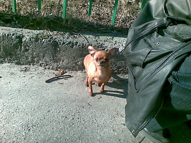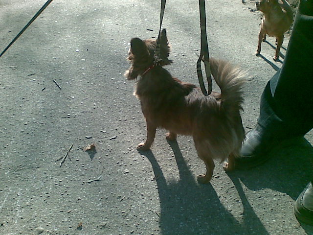 Элька гулять не боится гуляет с удовольствием но больших собак боится сразу убегает от меня хорошо рулетка спасает что далеко не убежит.