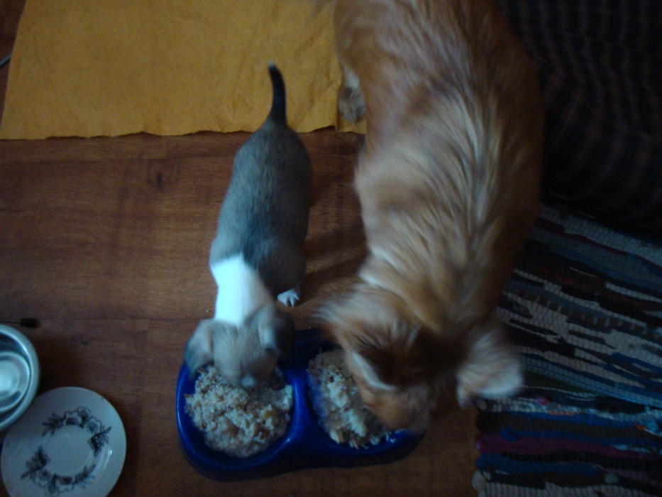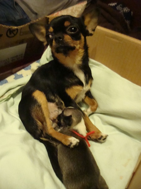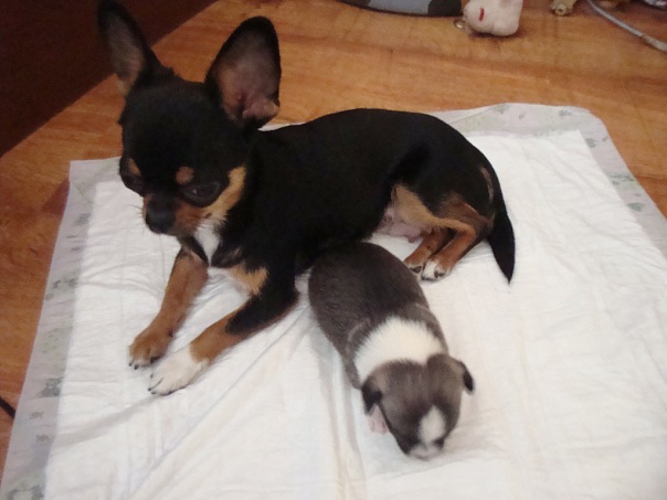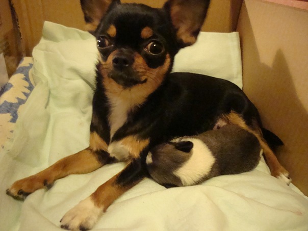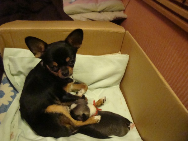 Роды -это отдельная песня! Вет не ожидала, что у нас все начнется так рано и стремительно и к началу она опоздала! первой шла девочка-ножками без пузыря, Мила сильно пикала-ей было больно! принимала девочку я. я сразу заметила, что она не присасывается к титьке! потом приехала вет-что только она с ней не делала, но девочка не дышала носиком-была непроходимость носовых ходов....потом родился Лукас-крупный и активный! я с надеждой спрашивала-может там еще есть кто то?....но больше щеночков не было! а потом бессонные ночи и дни, подчиненные кормежке из шприца девочки каждые 1.5-2 часа.....на третьи сутки она все-таки погибла! а я взяла коробку с Милой и щенком к себе на кровать и так они жили у меня три недели! под неусыпным вниманием!
