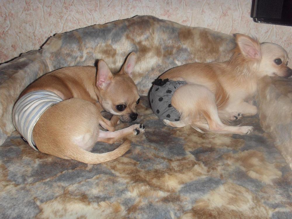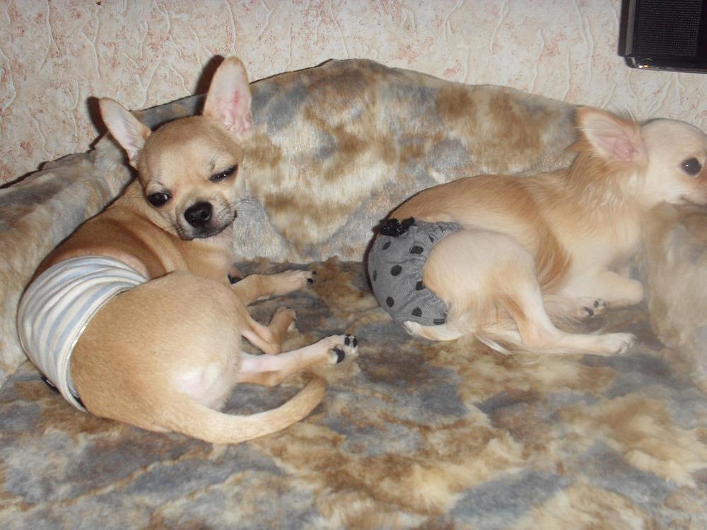 Несколько дней для меня и моих чихуашечек прошли в мучениях прошло примерно две недели с начала течки Мимуськи и она стала подставляться под Сёмку хотя до этого всегда скидывала его и не давала на себя забраться. С начала течки я следила за ними и ни на минуту одних не оставляла, если готовила то кого-то брала собой на кухню. А теперь просто у обоих крышу снесло, и мне как я не хотела пришлось по очереди их сажать на ночь и иногда днем в вольер, Мими от возмущения начинала гавкать а Сёмочка скулить и мне это очень тяжел был слышать. Прям плакать хотелась, но то что они могут сделать деток больше меня пугает. Вот так теперь мы и живем, общаются только при мне и одетые, Мимка в трусах а Сёмочка в поясе для мальчиков, но трусы Сёмка с Мимки зубами снимает, хорошо что пояс широкий и самим им не снять его. Жду не дождусь когда кончится течка, и мы заживем как раньше.