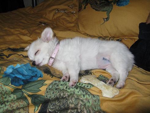 Ага, в ошейнике и на кровати-вот оно воспитание! А где должна спать? На своем месте!:wink: