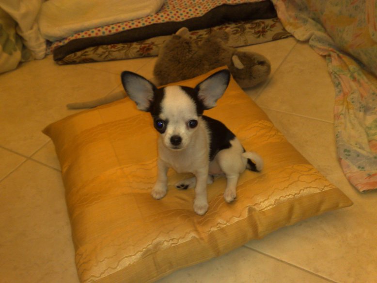 ПОкупали не из Питомника, увидели ее фото на сайте и я сразу же в нее влюбилась=) Позвонили хозяйке, узнали что за нее и еще одного малыша пока залог не внесен и можем приехать посмотреть=) Ну а уж когда я ее увидела не на фото а живьем, да еще когда она ко мне сразу же подошла и за палец лизнула, тут уж и говорить не о чем было=) в 4 месяца весит примерно 1кг.370гр.,а вот как рост правильно померить не знаю, когда сидит, то в холке где то 18-20 см=)А вот насчет питомника нам заводчица сказала, что мы со щенячкой можем обратиться в любой клуб, но не знаю правда ли это? А мама ее из Московского областного клуба "Миллениум"...