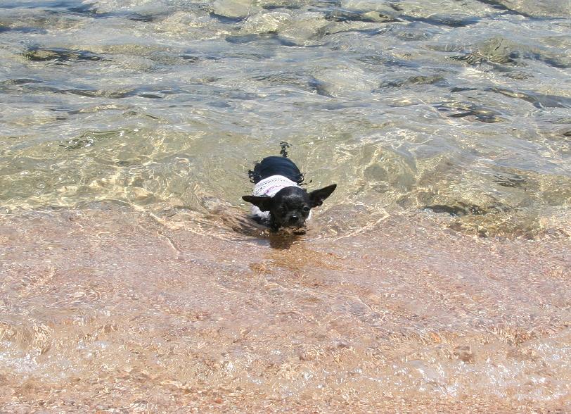 Как выяснилось, Юика любит солнце, хоть и черная. Я за нее переживала, что она перегреется, пыталась уложить в тень, но она упорно выползала на солнце. Во такие дела. А вообще, всем советую брать собаку с собой! Она такое удовольствие получает! Вчера, правда, день был пасмурный и мы часов 5 на базаре провели, а Юика в сумке соответственно, но ничего, спала спокойно, даже вылезти не пыталась. Много, конечно, страхов за нее и переживаний, но с детьми, я думаю, гораздо сложнее. Так что, если не боитесь трудностей и планируете пляжный отдых - собака будет рада составить компанию!