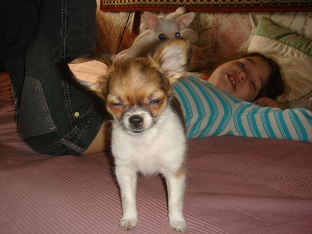 Когда я выбрала своих девчонок, зашла на этот сайт. Сразу влюбилась в Джессику у Софии и поняла, что очень мне нравится тигровый окрас. Потом узнала, что Татьяна скоро ждет прибавления и стала вместе с ней ждать. Все думала, что мое желание иметь тигровую девочку поубавится, ведь уже есть две чиходевочки. Но оно все не убавлялось и не убавлялось. Вот так сегодня оно и осуществилось. Когда сегодня приехала к Татьяне и взяла в руки в девочку, зразу влюбилась.Теперь я снова в ожидание.:dancers: А моим девчонкам сегодня сделали прививку. Завтра нам три месяца. Вес у Буськи 950, Снежки 830. Готовимся к первой прогулке, учимся ходить на поводке. Вчера примеряли вещички ранее купленные. Снежке все по прежнему великовато. А вот Буся выросла до красивого красного комбезика. :clapping: