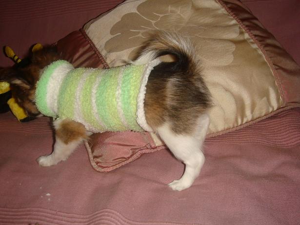 Да мы, что то закрутились совсем. Девчонки молодцы, в туалет уже приучились правильно ходить. Ночами спим, только рано просыпаемся. Накупили одежки, а все большое. Сегодня сделали свитерочки из носков, здорово получилось. В выходные пойдем погуляем на ручках. На фотках в наших свитерочках. А полосатенький красненький прикупили, но из него вылазим.