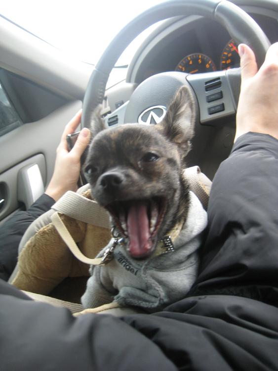 На Пасху мы ездили на дачу к родственникам все вместе. Хотя на фотографиях похоже, как будто они поют, на самом деле они позевали и проспали всю дорогу :sm496: . В гостях Бонечка освоился моментально, охотно со всеми общался, даже спал у гостей на руках, но целовать посторонних отказывался наотрез. А на прогулке Марта показала ему как здоровско грызть палочку и даже откусила для него щепочку. В общем, социализация пока проходит успешно, постепенно перестаем бояться улицы.:dancers:
