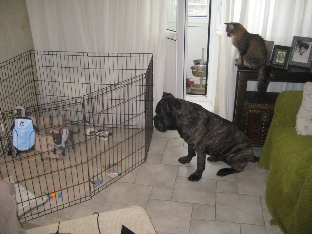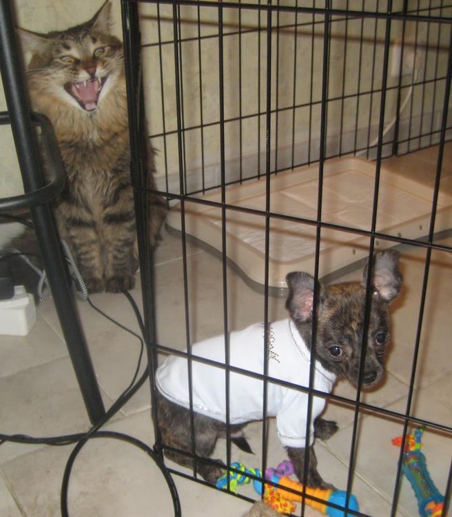 Наглый кошарик решил, что может безнаказанно проникнуть в вольер и есть Бонечкину еду! Но встретил грозное сопротивление...:tearsofjoy: