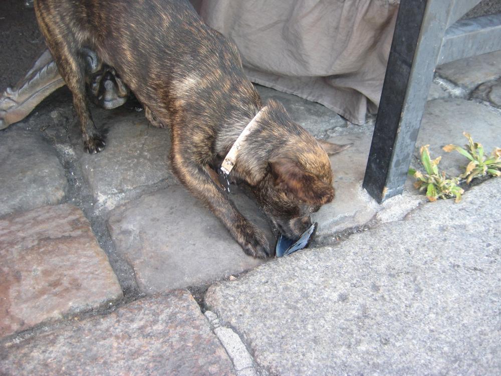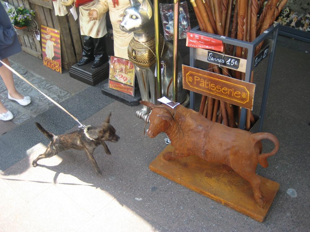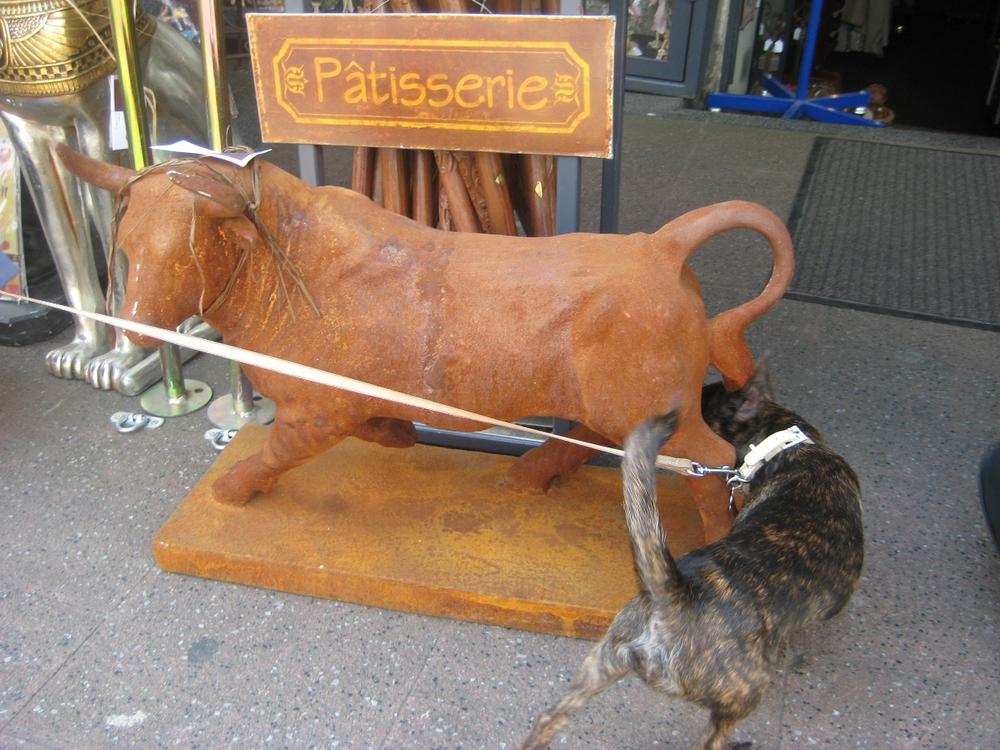 Боня продолжает проявлять уже пугающую меня склонность к статуям животных. На этот раз мы встретили "заколдованного" бычка. А в одной лавке мы нашли лающую варежку - она вызвала у Бони дикий ужас и оцепенение. Но и "нормальных" собак мы тоже не пропускаем мимо!