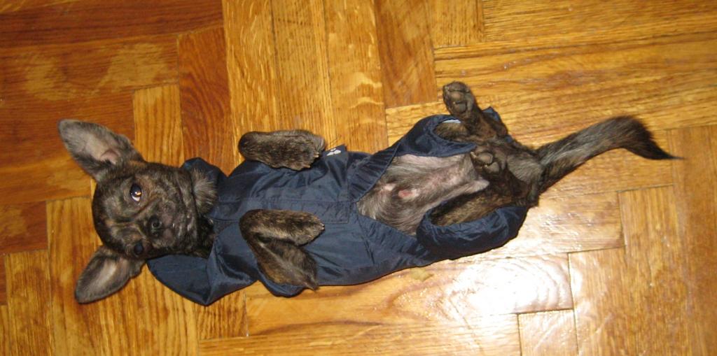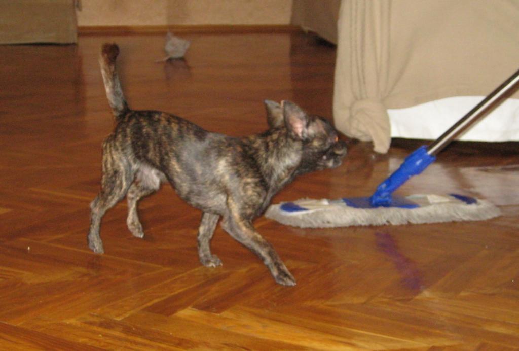 В связи с дождливой погодой решили натянуть на Боню прошлогодний комбинезон-дождевик. Боня продолжал изображать полную неспособность двигаться в одежде, а мы пролжали издеаться над "онемевшим тельцем" придавая ему разные позы и снимая на фотик... На улице он не выдержал и все-таки пошел, всем своим видом показывая как тяжело ему это дается. Зато когда пришли домой и разделись, весь гнев был вымещен на швабре - тут Боня был беспощаден!