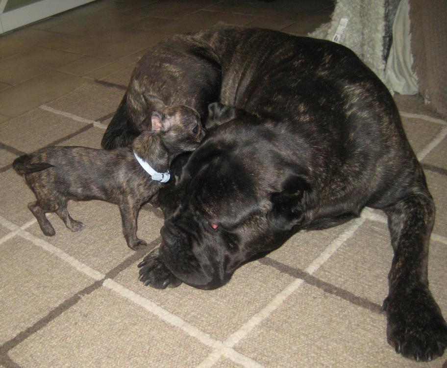 Бонечке становится окончательно "тесно" в вольере. Требует выпустить его на волю... Я сегодня попыталась дать ему "погулять" но он стал носиться по квартире с ТАКОЙ скоростью, что кот пытался его напугать, встав у него на пути, но ни разу не успел, а Марта пыталась задержать его лапой (чего я больше всего боюсь) чтоб его обстоятельно обнюхать. Пытаюсь ей донести, что лапы в общении с ребенком надо держать при себе. Дала ей команду лежать а Бонечка наворачивал вокруг круги козлиным галопом, Марта не успевала поворачивать голову и вся изнервничалась.