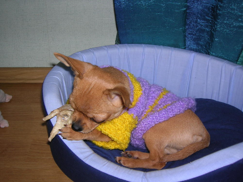 Вот решила попробовать связать что-то для малышки. Пока мама с папой ужинают, Рози занимается своими важными делами.:gold: