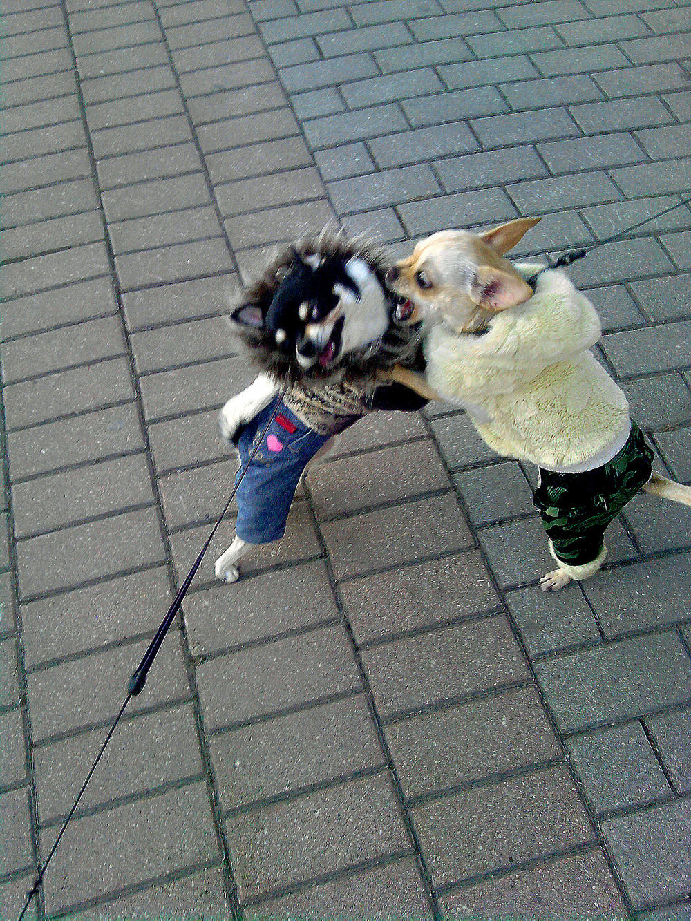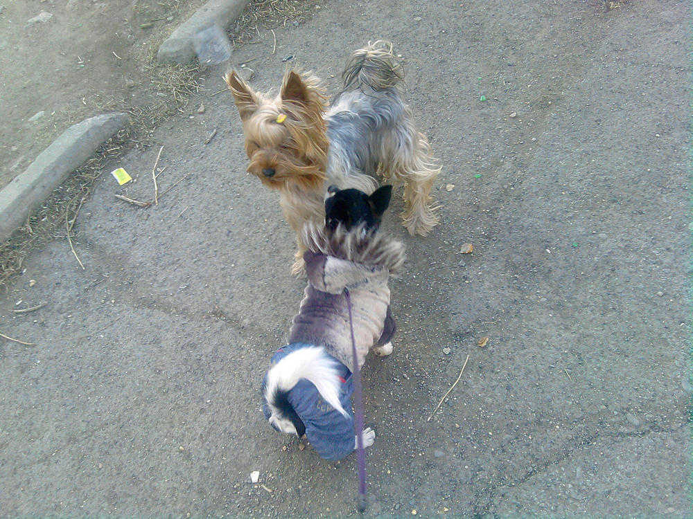 Вечерком гуляла с Биной. Встретили своих маленьких друзей! На 1-ой фотографии Бина с йорком, а на остальных-со своей невестой! :kissing: Во как! Девочку зовут Леди. :smiling: