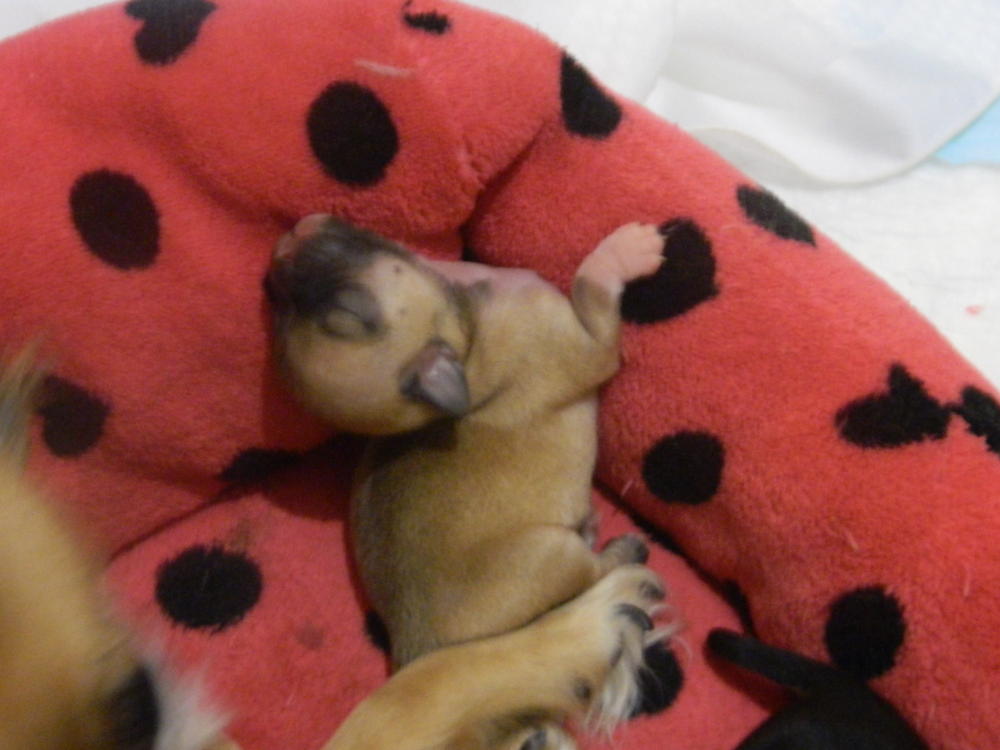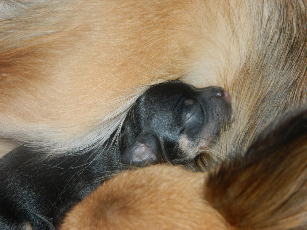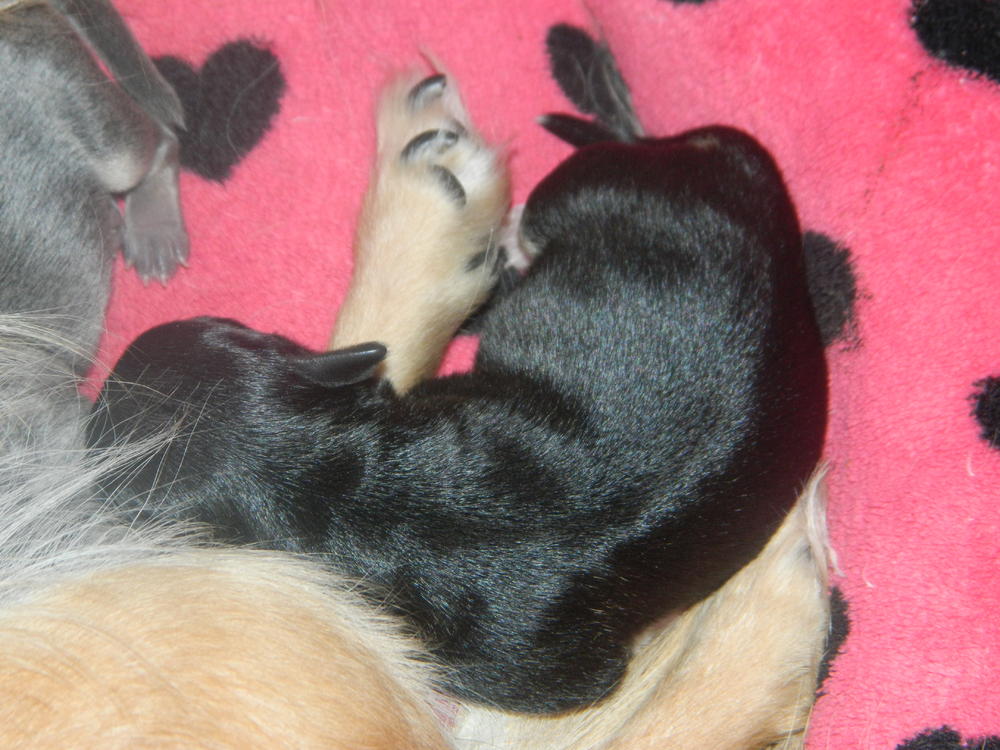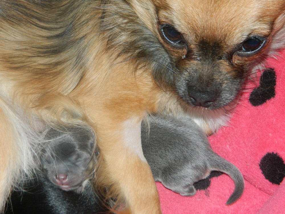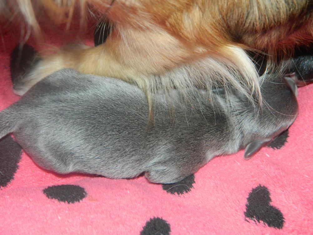 Мая красавица родила трех карапузов 24 ноября. Так что у нас три щеночка, две девочки и лапочка мальчишка! Первая девочка родилась рано утром пришлось принемать роды самой слава Богу све прошло благополучно!!!! Потом муж схватил нас в ахапку и поехали в больницу, между первым и вторым щенком прошло больше 5 часов, как только врач сказал что если не родит в течении 15 минут будем кесарить, поставили котетор и она решила сама рожать, вторая родилась девочка, и буквально сразу родился пацан, такой щустрый сам лапами плеву порвал и сразу начал пищать. Алексей не глядя сказал -это Пацан. Первая девочка это клоник мамы в детсве, такая рыженькая темная маска на мордочке, по спинке темная полосочка и хвостик темный, Вторая девченка чисто голубая у меня аж дыхание захватывает я такой цвет не видела у нее серебренный даже стальной отлив, А пацан - это клоник Пусиной мамы весь черный как уголь, белая грудка на одной лапке белый гольфик на второй белый насочек, а на задних лапках маленькие белые тапочки.