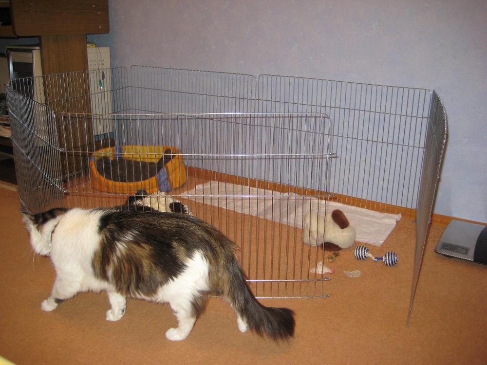Итак, как и обещала - выкладываю фотки вольера. Сделаны были в первый день, как только установили - сейчас там застелено клееночкой, уж больно надоело нам драить ковролин )))