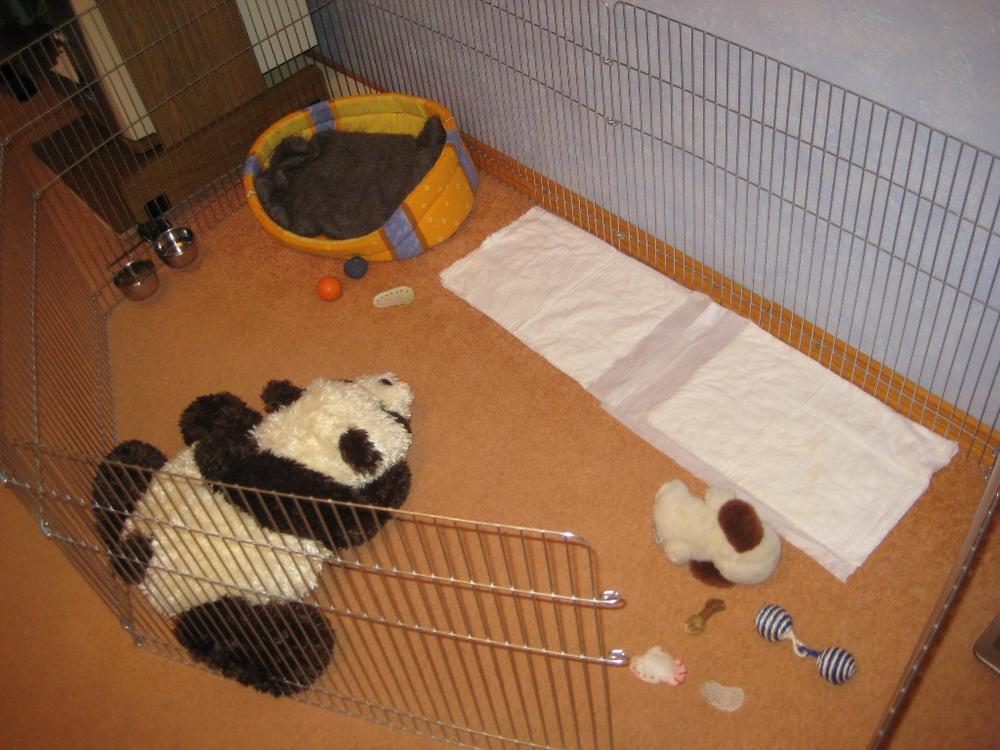 К вольеру приучаемся - сегодня без всякого плача там осталась, когда я уходила.