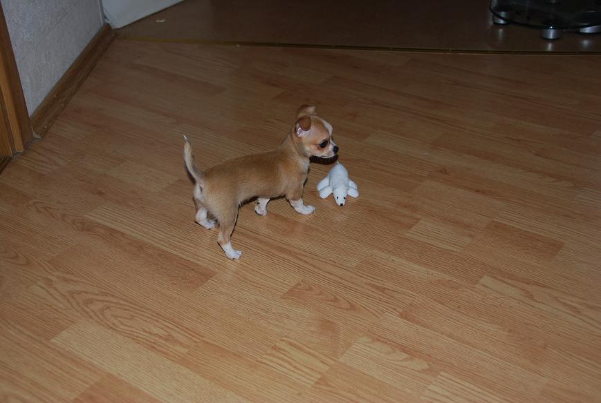 Уже вовсю пытается запрыгнуть на диван и с удовольствием бегает с игрушками. А также активно интересуется обувью, но мы ей не разрешаем, надеемся, что удастся отучить от щенячей привычки грызть что попало))).